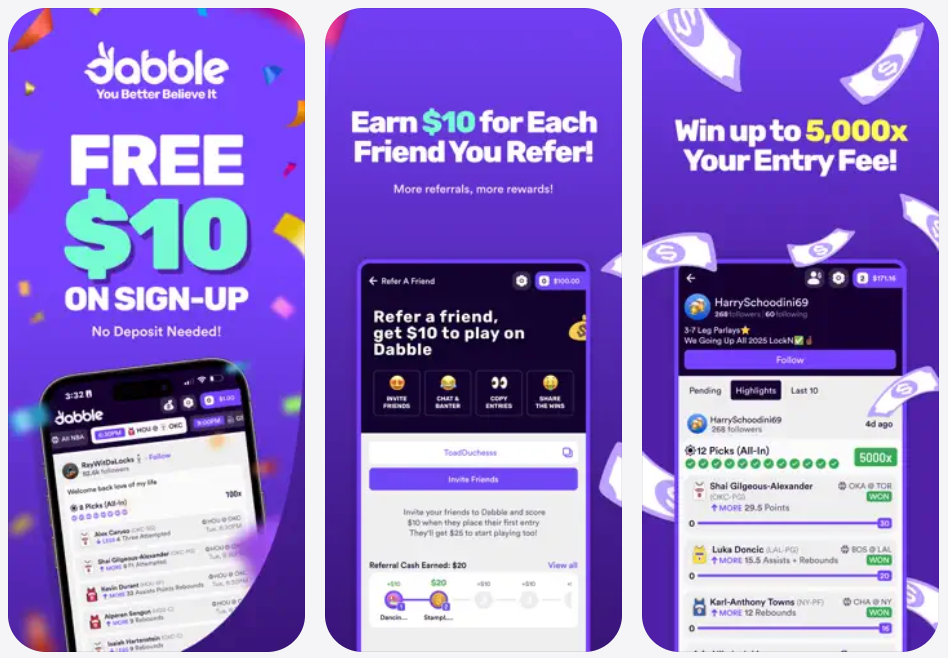 Dabble is a real-money daily fantasy sports pick'em app with a social-first design, available in 31+ U.S. states.