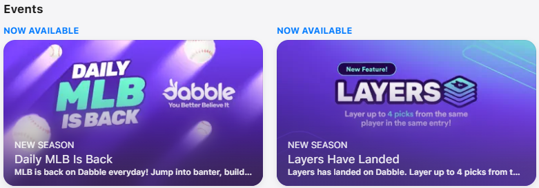 Dabble currently offers pick'em contests for NFL, NBA, NHL, MLB, CFB, CBB, EPL, tennis, UFC, CS2, EuroLeague, Bundesliga, and LaLiga.