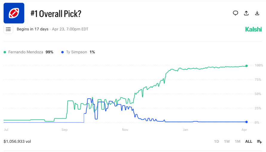 There's a new wrinkle this year in our 2026 NFL Draft Betting Guide. Multiple prediction markets offer trades on the NFL draft. Kalshi, for example, has 31 different draft-related markets. Those are focused on both players being selected at a certain spot in the draft. And on which team will draft a specific player. More than $1 million has been traded in its No. 1 overall pick market, which opened last July.
