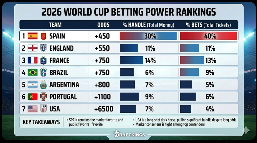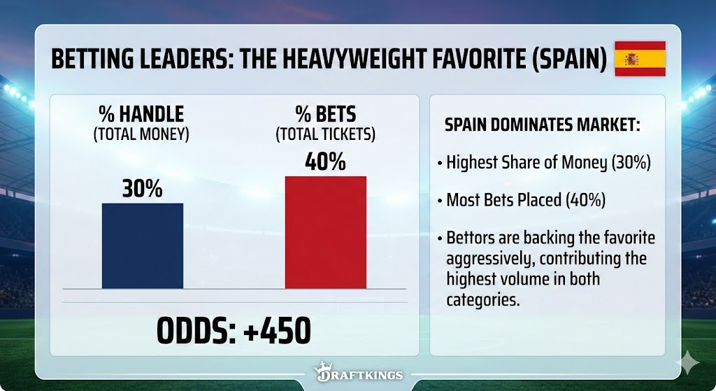 At DraftKings, Caesars, and elsewhere, the early money has landed on Spain. The country has 30% of DraftKings’ handle to win the Cup.