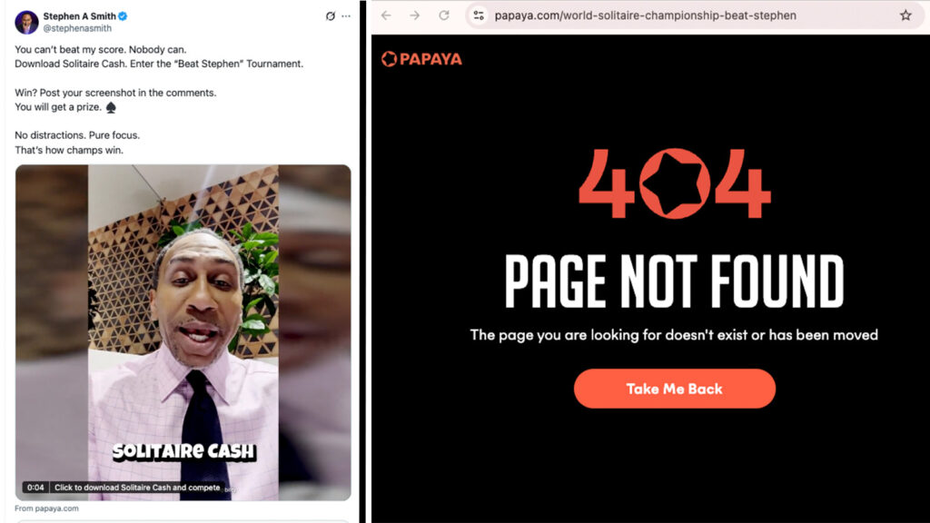 Smith agreed to hype Papaya Gaming’s new Solitaire World Championship in Miami — even as Papaya headed to trial over allegations it juiced past tournaments with house bots. The company plans to fly 400 app qualifiers to a five-star mystery resort next February to chase $300,000 in prizes, with promotional spots that had blended real Stephen A. footage and AI imagery.