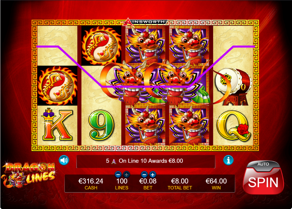 Dragon Lines comes with 100 paylines, but by reducing the active lines to one, you can play for $0.01 per spin - but remember the more active paylines you have, the better chance of landing a winning combination. This penny slot online game might look a little old-fashioned compared to other modern video slots, but it’s no less fun.