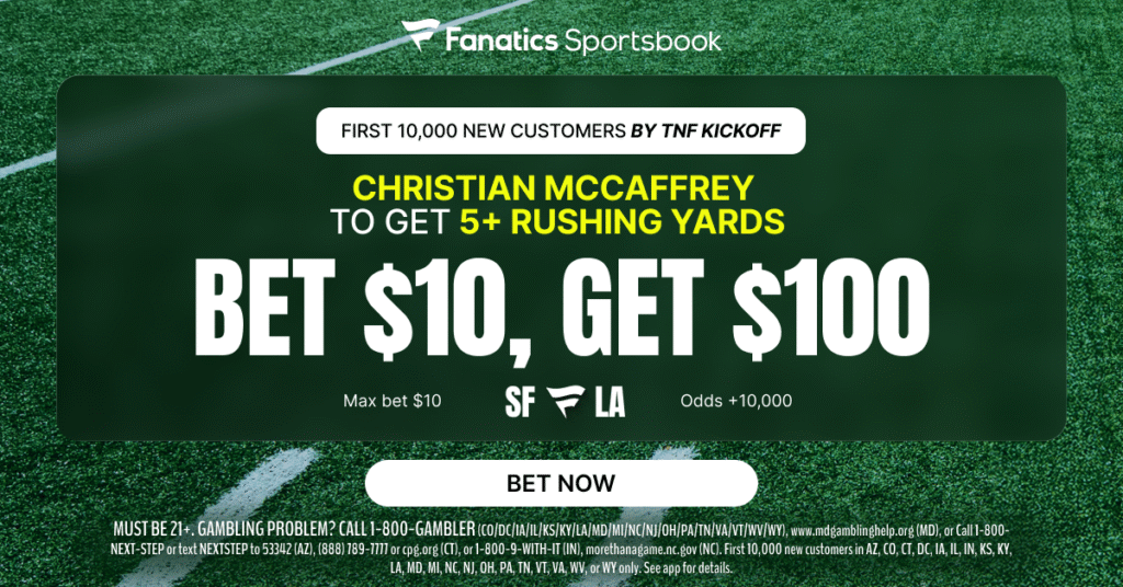 Fanatics Sportsbook has rolled out an upgraded welcome bonus just in time for NFL Week 5: Get $50 FanCash per day, up to $250 total over 5 days, plus, for the first 10K NEW users will get the Bet $1, Get $100 if Christian McCaffrey Rushes 5+ Yards. This exclusive offer makes Fanatics one of the best sports betting sites in the US for this week’s NFL slate.