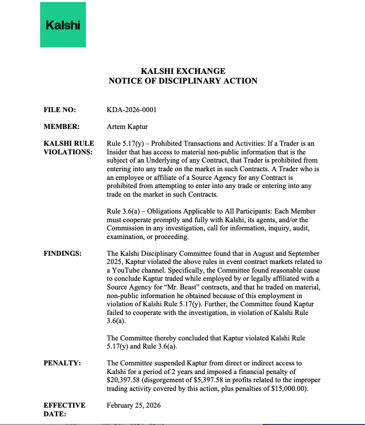 Kalshi’s surveillance department identified the video in May, froze the account immediately, and opened an investigation. According to Kalshi, the candidate acknowledged the conduct violated exchange rules prohibiting trading in contracts where a participant has direct or indirect influence over the outcome.