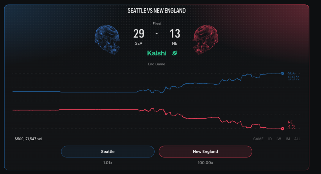 Following Seattle's 29-13 victory over New England, the site's "Pro Football Champion" market surpassed the $500 million figure. Some trades on the site were delayed in being posted during the game, Kalshi said, but trades were executed in real time.