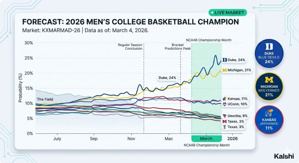 Prediction markets offering sports-event contracts are also available in all 50 states, depending on the operator. They offer traders on each game. Kalshi, for example, has traded more than $38.6 million in its Men's College Basketball Champion market that opened on October 29.