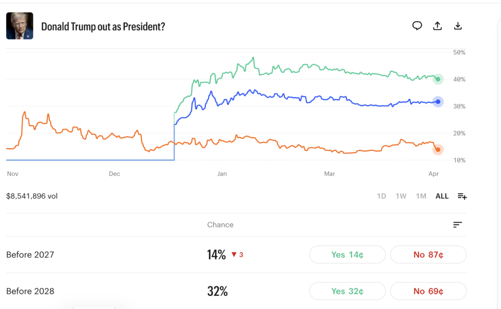 The prediction market's "Trump out as President before 2027?" offering has $7,462,185 in trades on Trump being out of office by the end of the year. The odds are currently 17%.