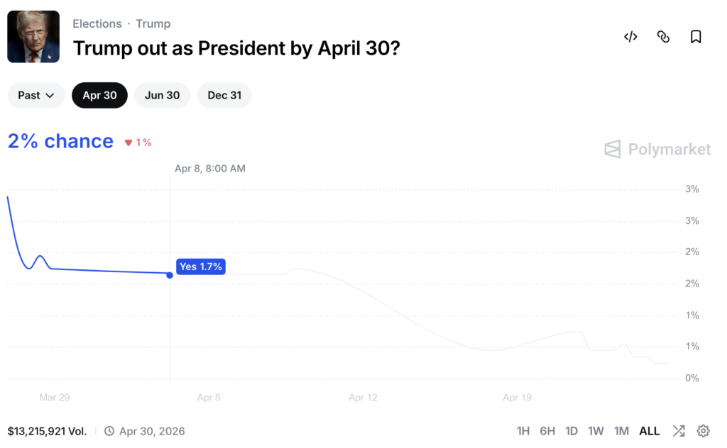 On Polymarket's non-U.S. site, more than $13 million in trades had been placed as to whether Trump would be out of office by April 30.