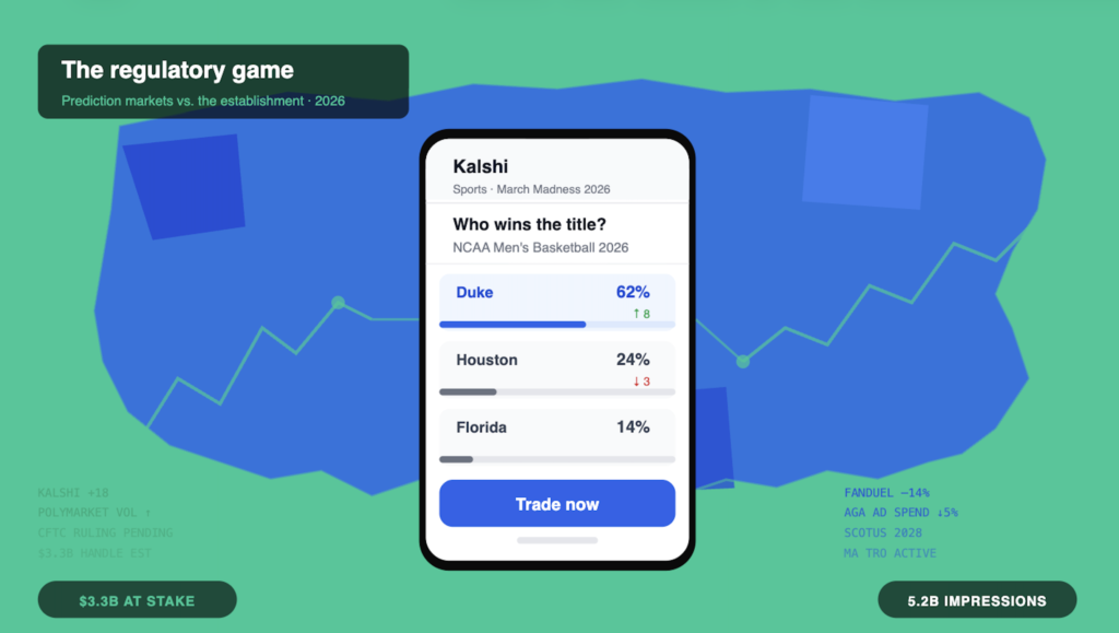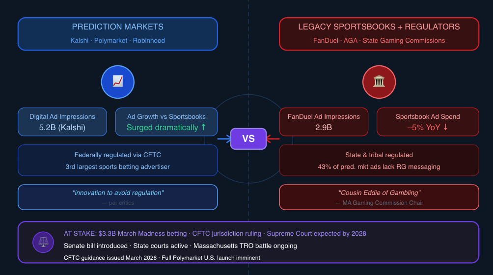 NEW YORK – With the NCAA Men’s and Women’s March Madness expected to generate $3.3 billion in legal betting revenue and Selection Sunday at hand, the ongoing fight between legacy betting operators, sportsbooks and regulators against prediction markets this week intensified outside the courtroom.