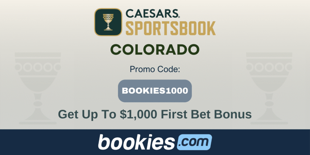 The Caesars Sportsbook Colorado promo code BOOKIES1000 gives new customers back up to $1,000 first bet bonus if your first bet loses. First, download this amazing Colorado betting app, then sign up for a new Caesars Sportsbook account, deposit at least $20, and then make your first bet. If it loses, get back up to $1,000 in the form of one single bonus bet from Caesars Sportsbook Colorado.