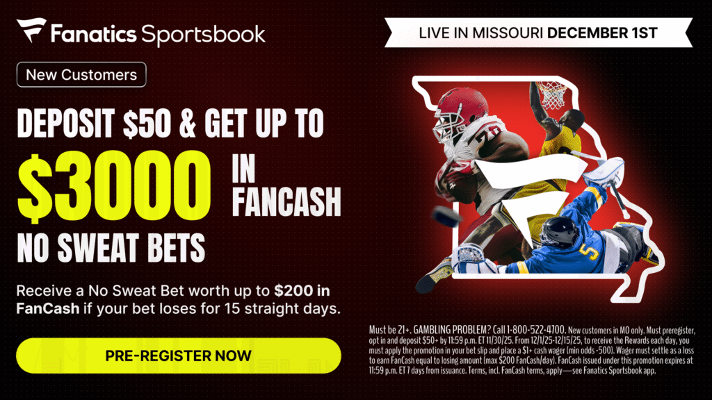 Pre-registration opens today with Fanatics Sportsbook Missouri so that you can secure its generous welcome bonus: Open a Missouri Fanatics Sportsbook account, and deposit at least $50, and you’ll score 15 No-Sweat Bets, one per day for 15 straight days. Place a wager of $1+ on any market with odds of -500 or longer. If your wager settles as a loss, you’ll get your investment back in FanCash up to $200 per day.