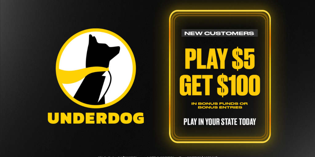 New customers can sign up for the Underdog Fantasy Promo Code BDC to play $5 and get $100 in bonus funds. Use your bonus funds at Underdog Fantasy to play all of the different DFS games available, including Best Ball, Daily Drafts, and Pick ‘Em, for all sorts of sports, including NFL, MLB, NBA, WNBA, Esports, Racing, Soccer, MMA, NHL, Tennis, College Football, and College Basketball.