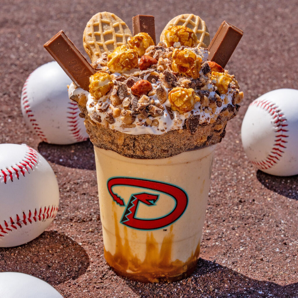 Philly Phanatics can take a swing at the Schwarbomb Sundae. This sweet tower of power consists of a mini helmet filled with soft-serve ice cream and topped with “a funnel-cake-fried strawberry Uncrustable, fresh strawberry sauce and fruity cereal pieces.”
