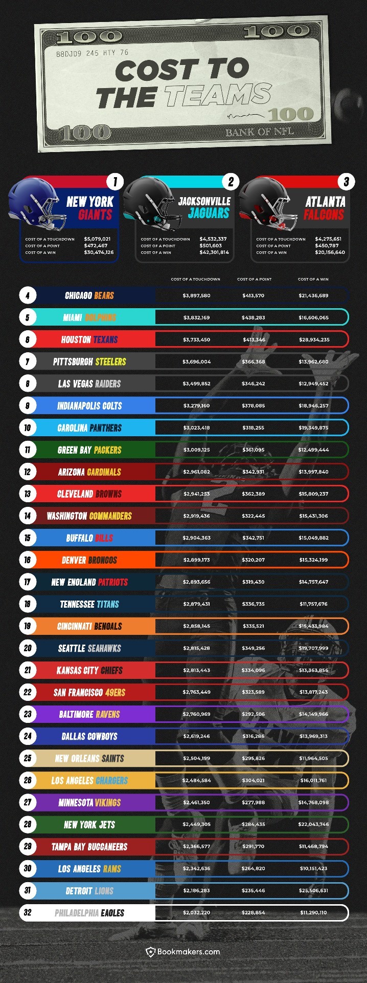 We’ve analyzed last year’s regular season results to determine just how much every touchdown, point and win cost each NFL team and its respective fanbase. Read on to see where your team ranks!