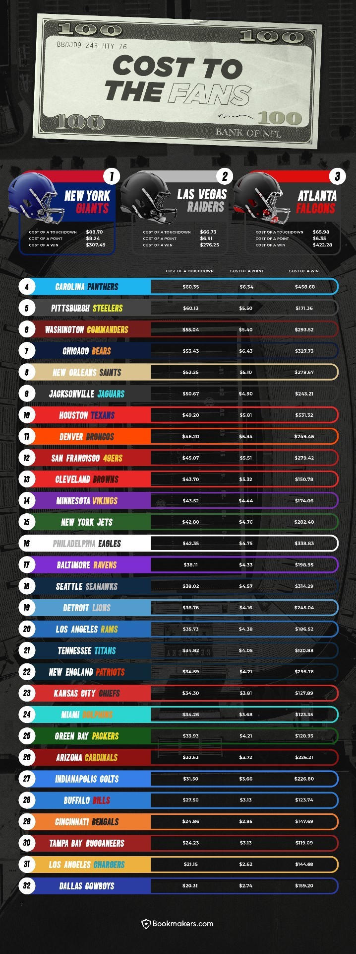 The next most expensive team per touchdown last season was the Las Vegas Raiders, whose supporters spent $66.73 per score. Raiders fans were also made to pay $6.91 per point, the second-most of any NFL franchise, and $276.25 per win.
