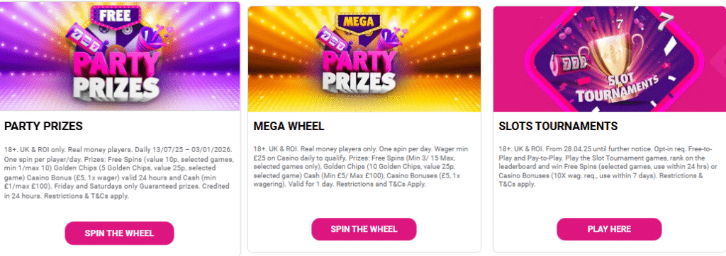 Party Casino runs regular slots tournaments, where wagering on selected games could see you walking away with a prize. There are also offers in conjunction with the software providers. For example, the Pragmatic Play casino Drops & Wins promo where you could win a random cash prize.