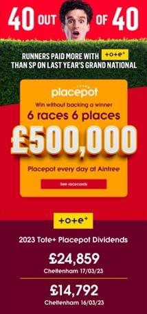 Free Placepot on Grand National Day – Tote are giving all customers a free shot at the placepot on Saturday. This is available to new and existing customers, so be sure to sign up ahead of Saturday to claim your free placepot on the Grand National Day.